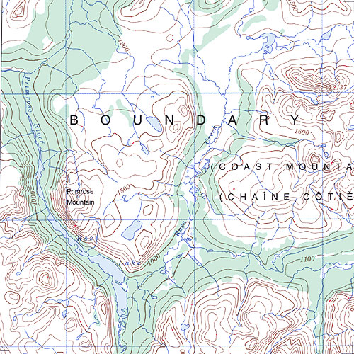 The topo map image to the left is not an exact representation. The image is based on the 1:1,000,000 scale map of the Yukon Territory. The actual 1:250,000 and 1:50,000 scale maps have additional detail not shown at the 1:1,000,000 level.