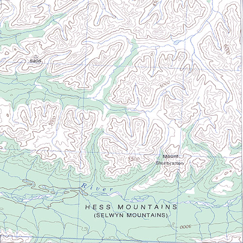 The topo map image to the left is not an exact representation. The image is based on the 1:1,000,000 scale map of the Yukon Territory. The actual 1:250,000 and 1:50,000 scale maps have additional detail not shown at the 1:1,000,000 level.
