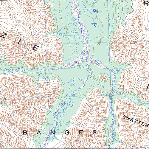 | The topo map image to the left is not an exact representation. The image is based on the 1:1,000,000 scale map of the Yukon Territory. The actual 1:250,000 and 1:50,000 scale maps have additional detail not shown at the 1:1,000,000 level. |