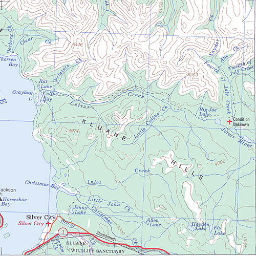 The topo map image to the left is not an exact representation. The image is based on the 1:1,000,000 scale map of the Yukon Territory. The actual 1:250,000 and 1:50,000 scale maps have additional detail not shown at the 1:1,000,000 level.