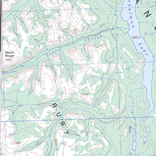 The topo map image to the left is not an exact representation. The image is based on the 1:1,000,000 scale map of the Yukon Territory. The actual 1:250,000 and 1:50,000 scale maps have additional detail not shown at the 1:1,000,000 level.