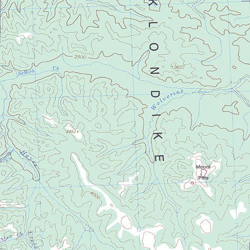 The topo map image to the left is not an exact representation. The image is based on the 1:1,000,000 scale map of the Yukon Territory. The actual 1:250,000 and 1:50,000 scale maps have additional detail not shown at the 1:1,000,000 level.