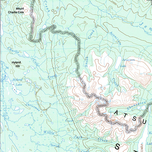 The topo map image to the left is not an exact representation. The image is based on the 1:1,000,000 scale map of the Yukon Territory. The actual 1:250,000 and 1:50,000 scale maps have additional detail not shown at the 1:1,000,000 level. |