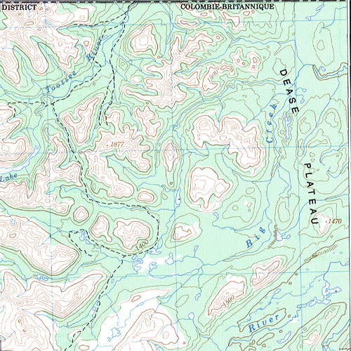 The topo map image to the left is not an exact representation. The image is based on the 1:1,000,000 scale map of the Yukon Territory. The actual 1:250,000 and 1:50,000 scale maps have additional detail not shown at the 1:1,000,000 level. |