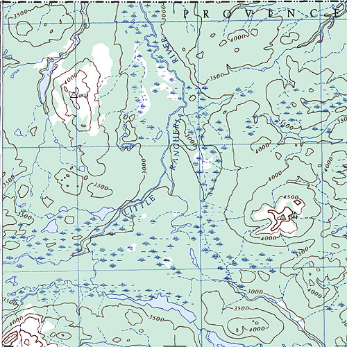 The topo map image to the left is not an exact representation. The image is based on the 1:1,000,000 scale map of the Yukon Territory. The actual 1:250,000 and 1:50,000 scale maps have additional detail not shown at the 1:1,000,000 level. |