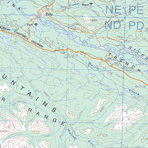 The topo map image to the left is not an exact representation. The image is based on the 1:1,000,000 scale map of the Yukon Territory. The actual 1:250,000 and 1:50,000 scale maps have additional detail not shown at the 1:1,000,000 level.