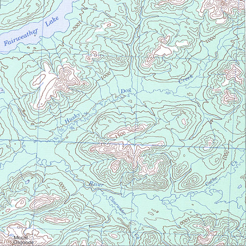 The topo map image to the left is not an exact representation. The image is based on the 1:1,000,000 scale map of the Yukon Territory. The actual 1:250,000 and 1:50,000 scale maps have additional detail not shown at the 1:1,000,000 level.