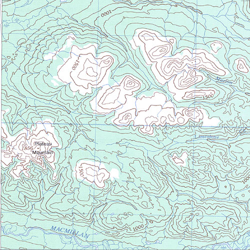 | The topo map image to the left is not an exact representation. The image is based on the 1:1,000,000 scale map of the Yukon Territory. The actual 1:250,000 and 1:50,000 scale maps have additional detail not shown at the 1:1,000,000 level. |