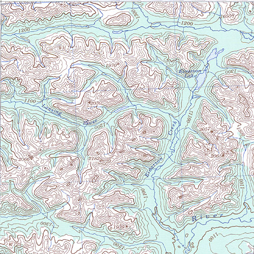 The topo map image to the left is not an exact representation. The image is based on the 1:1,000,000 scale map of the Yukon Territory. The actual 1:250,000 and 1:50,000 scale maps have additional detail not shown at the 1:1,000,000 level.