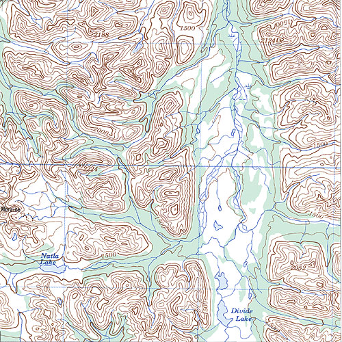 The topo map image to the left is not an exact representation. The image is based on the 1:1,000,000 scale map of the Yukon Territory. The actual 1:250,000 and 1:50,000 scale maps have additional detail not shown at the 1:1,000,000 level.