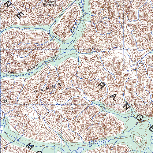 The topo map image to the left is not an exact representation. The image is based on the 1:1,000,000 scale map of the Yukon Territory. The actual 1:250,000 and 1:50,000 scale maps have additional detail not shown at the 1:1,000,000 level.