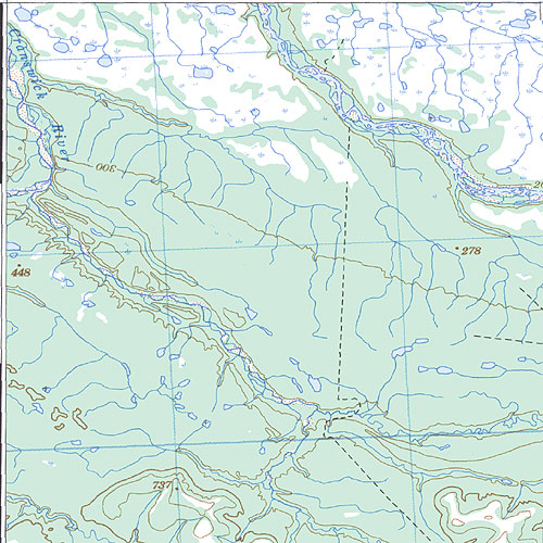 | The topo map image to the left is not an exact representation. The image is based on the 1:1,000,000 scale map of the Yukon Territory. The actual 1:250,000 and 1:50,000 scale maps have additional detail not shown at the 1:1,000,000 level. |