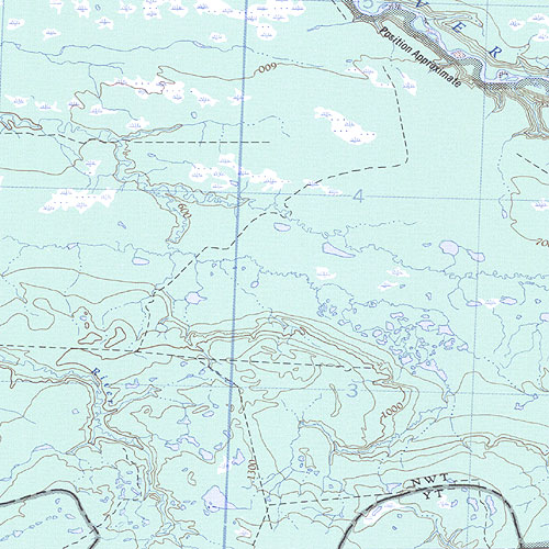 | The topo map image to the left is not an exact representation. The image is based on the 1:1,000,000 scale map of the Yukon Territory. The actual 1:250,000 and 1:50,000 scale maps have additional detail not shown at the 1:1,000,000 level. |