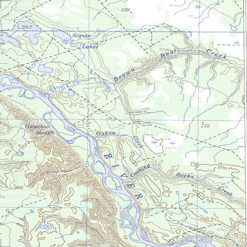 The topo map image to the left is not an exact representation. The image is based on the 1:1,000,000 scale map of the Yukon Territory. The actual 1:250,000 and 1:50,000 scale maps have additional detail not shown at the 1:1,000,000 level.