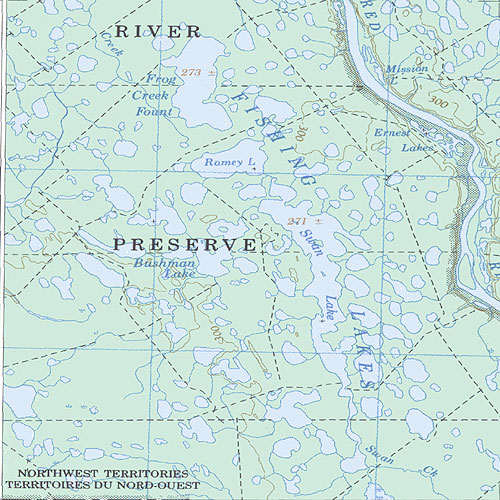| The topo map image to the left is not an exact representation. The image is based on the 1:1,000,000 scale map of the Yukon Territory. The actual 1:250,000 and 1:50,000 scale maps have additional detail not shown at the 1:1,000,000 level. |