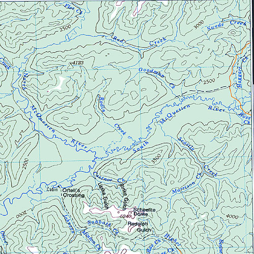 The topo map image to the left is not an exact representation. The image is based on the 1:1,000,000 scale map of the Yukon Territory. The actual 1:250,000 and 1:50,000 scale maps have additional detail not shown at the 1:1,000,000 level.