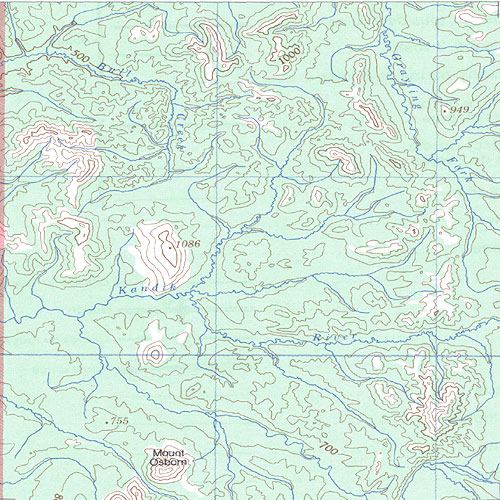 | The topo map image to the left is not an exact representation. The image is based on the 1:1,000,000 scale map of the Yukon Territory. The actual 1:250,000 and 1:50,000 scale maps have additional detail not shown at the 1:1,000,000 level. |