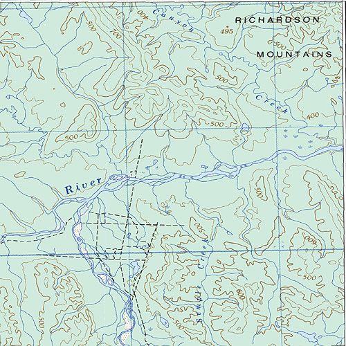 The topo map image to the left is not an exact representation. The image is based on the 1:1,000,000 scale map of the Yukon Territory. The actual 1:250,000 and 1:50,000 scale maps have additional detail not shown at the 1:1,000,000 level.