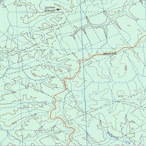 The topo map image to the left is not an exact representation. The image is based on the 1:1,000,000 scale map of the Yukon Territory. The actual 1:250,000 and 1:50,000 scale maps have additional detail not shown at the 1:1,000,000 level.
