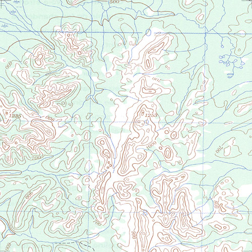 | The topo map image to the left is not an exact representation. The image is based on the 1:1,000,000 scale map of the Yukon Territory. The actual 1:250,000 and 1:50,000 scale maps have additional detail not shown at the 1:1,000,000 level. |