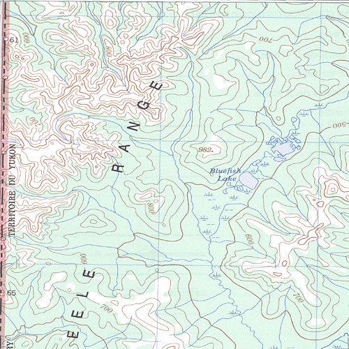 The topo map image to the left is not an exact representation. The image is based on the 1:1,000,000 scale map of the Yukon Territory. The actual 1:250,000 and 1:50,000 scale maps have additional detail not shown at the 1:1,000,000 level.
