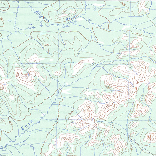 The topo map image to the left is not an exact representation. The image is based on the 1:1,000,000 scale map of the Yukon Territory. The actual 1:250,000 and 1:50,000 scale maps have additional detail not shown at the 1:1,000,000 level.