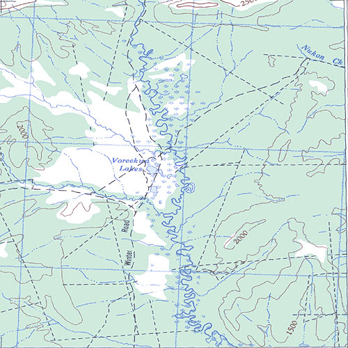 The topo map image to the left is not an exact representation. The image is based on the 1:1,000,000 scale map of the Yukon Territory. The actual 1:250,000 and 1:50,000 scale maps have additional detail not shown at the 1:1,000,000 level.
