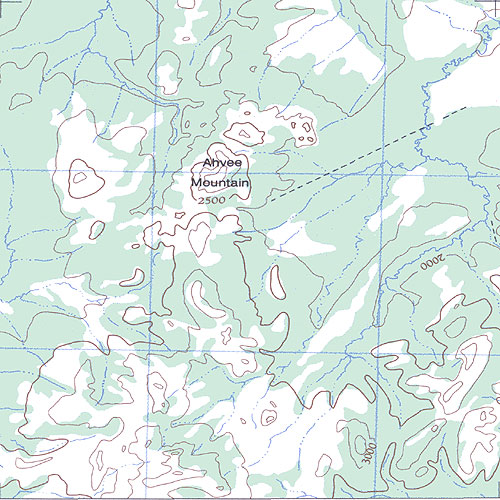 The topo map image to the left is not an exact representation. The image is based on the 1:1,000,000 scale map of the Yukon Territory. The actual 1:250,000 and 1:50,000 scale maps have additional detail not shown at the 1:1,000,000 level.