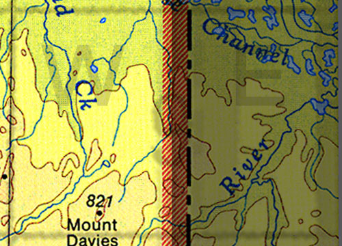 | The topo map image to the left is not an exact representation. The image is based on the 1:1,000,000 scale map of the Yukon Territory. The actual 1:250,000 and 1:50,000 scale maps have additional detail not shown at the 1:1,000,000 level. |