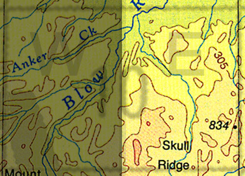 | The topo map image to the left is not an exact representation. The image is based on the 1:1,000,000 scale map of the Yukon Territory. The actual 1:250,000 and 1:50,000 scale maps have additional detail not shown at the 1:1,000,000 level. |