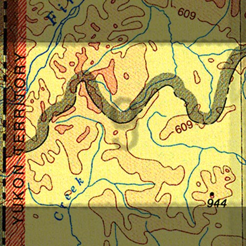 The topo map image to the left is not an exact representation. The image is based on the 1:1,000,000 scale map of the Yukon Territory. The actual 1:250,000 and 1:50,000 scale maps have additional detail not shown at the 1:1,000,000 level.