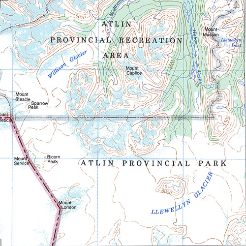 The topo map image to the left is not an exact representation. The image is based on the 1:1,000,000 scale map of the Yukon Territory. The actual 1:250,000 and 1:50,000 scale maps have additional detail not shown at the 1:1,000,000 level.