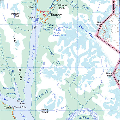 The topo map image to the left is not an exact representation. The image is based on the 1:1,000,000 scale map of the Yukon Territory. The actual 1:250,000 and 1:50,000 scale maps have additional detail not shown at the 1:1,000,000 level.
