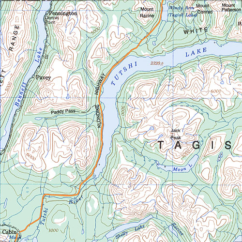 The topo map image to the left is not an exact representation. The image is based on the 1:1,000,000 scale map of the Yukon Territory. The actual 1:250,000 and 1:50,000 scale maps have additional detail not shown at the 1:1,000,000 level.