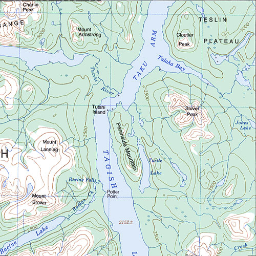 The topo map image to the left is not an exact representation. The image is based on the 1:1,000,000 scale map of the Yukon Territory. The actual 1:250,000 and 1:50,000 scale maps have additional detail not shown at the 1:1,000,000 level.