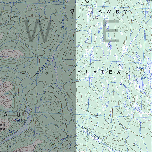 | The topo map image to the left is not an exact representation. The image is based on the 1:1,000,000 scale map of the Yukon Territory. The actual 1:250,000 and 1:50,000 scale maps have additional detail not shown at the 1:1,000,000 level. |