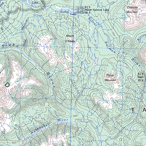 The topo map image to the left is not an exact representation. The image is based on the 1:1,000,000 scale map of the Yukon Territory. The actual 1:250,000 and 1:50,000 scale maps have additional detail not shown at the 1:1,000,000 level.