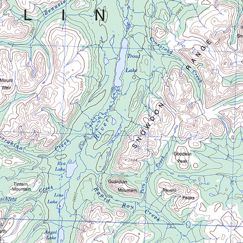 The topo map image to the left is not an exact representation. The image is based on the 1:1,000,000 scale map of the Yukon Territory. The actual 1:250,000 and 1:50,000 scale maps have additional detail not shown at the 1:1,000,000 level.