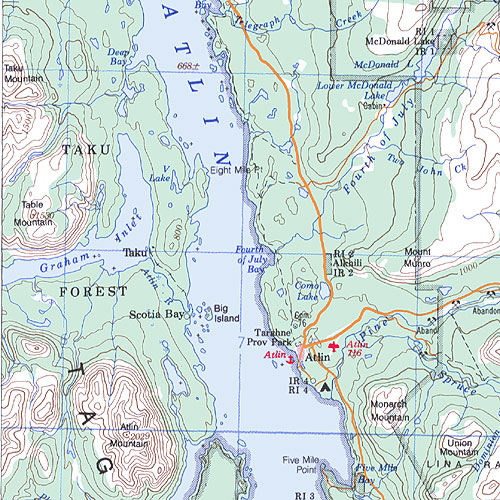The topo map image to the left is not an exact representation. The image is based on the 1:1,000,000 scale map of the Yukon Territory. The actual 1:250,000 and 1:50,000 scale maps have additional detail not shown at the 1:1,000,000 level.