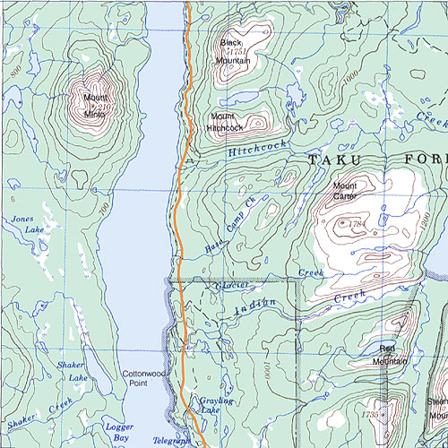 The topo map image to the left is not an exact representation. The image is based on the 1:1,000,000 scale map of the Yukon Territory. The actual 1:250,000 and 1:50,000 scale maps have additional detail not shown at the 1:1,000,000 level.