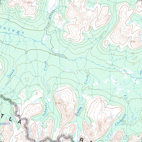 The topo map image to the left is not an exact representation. The image is based on the 1:1,000,000 scale map of the Yukon Territory. The actual 1:250,000 and 1:50,000 scale maps have additional detail not shown at the 1:1,000,000 level.