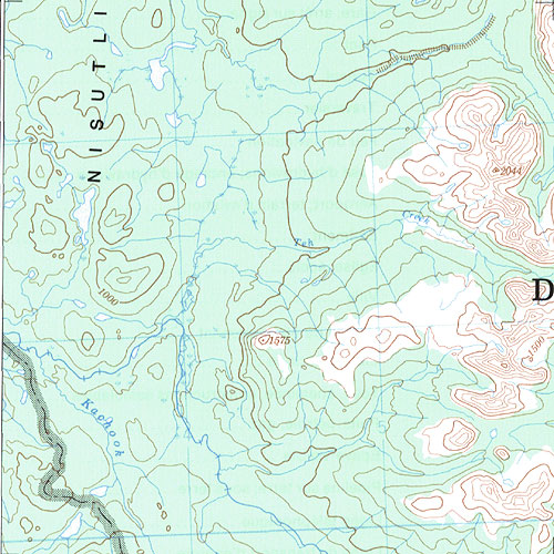 The topo map image to the left is not an exact representation. The image is based on the 1:1,000,000 scale map of the Yukon Territory. The actual 1:250,000 and 1:50,000 scale maps have additional detail not shown at the 1:1,000,000 level.