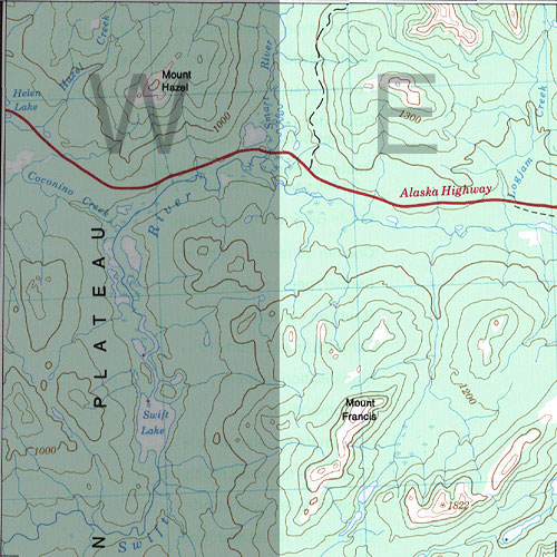 | The topo map image to the left is not an exact representation. The image is based on the 1:1,000,000 scale map of the Yukon Territory. The actual 1:250,000 and 1:50,000 scale maps have additional detail not shown at the 1:1,000,000 level. |