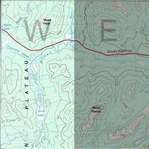 | The topo map image to the left is not an exact representation. The image is based on the 1:1,000,000 scale map of the Yukon Territory. The actual 1:250,000 and 1:50,000 scale maps have additional detail not shown at the 1:1,000,000 level. |