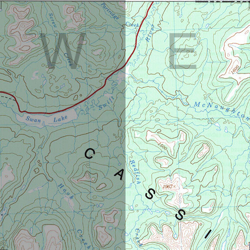| The topo map image to the left is not an exact representation. The image is based on the 1:1,000,000 scale map of the Yukon Territory. The actual 1:250,000 and 1:50,000 scale maps have additional detail not shown at the 1:1,000,000 level. |