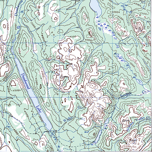 | The topo map image to the left is not an exact representation. The image is based on the 1:1,000,000 scale map of the Yukon Territory. The actual 1:250,000 and 1:50,000 scale maps have additional detail not shown at the 1:1,000,000 level. |