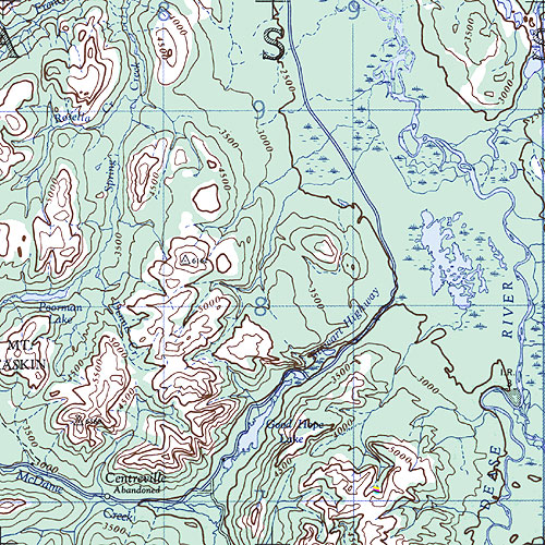 The topo map image to the left is not an exact representation. The image is based on the 1:1,000,000 scale map of the Yukon Territory. The actual 1:250,000 and 1:50,000 scale maps have additional detail not shown at the 1:1,000,000 level.