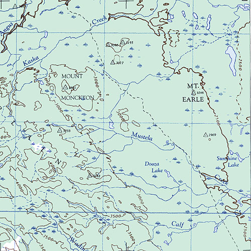 The topo map image to the left is not an exact representation. The image is based on the 1:1,000,000 scale map of the Yukon Territory. The actual 1:250,000 and 1:50,000 scale maps have additional detail not shown at the 1:1,000,000 level.