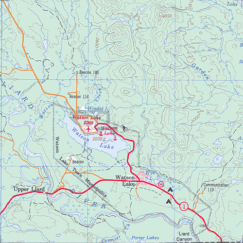 The topo map image to the left is not an exact representation. The image is based on the 1:1,000,000 scale map of the Yukon Territory. The actual 1:250,000 and 1:50,000 scale maps have additional detail not shown at the 1:1,000,000 level.