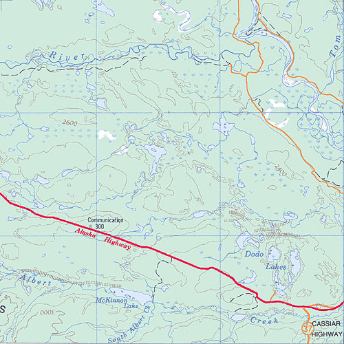 The topo map image to the left is not an exact representation. The image is based on the 1:1,000,000 scale map of the Yukon Territory. The actual 1:250,000 and 1:50,000 scale maps have additional detail not shown at the 1:1,000,000 level.